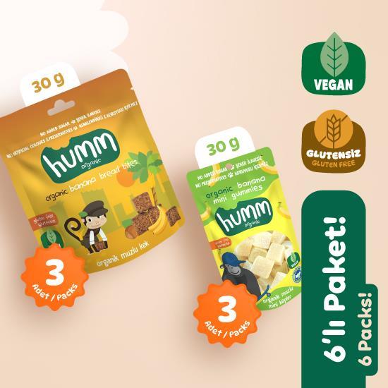 Humm Organic Glutensiz Vegan Muzlu Atıştırmalık Paketi, çeşitli muzlu atıştırmalıklarla dolu, lezzetli ve doyurucu bir atıştırmalık paketidir. Hem kek dilimleri hem de mini küpler, gününüzün her anına eşlik edebilecek neşeli lezzetlerdir.